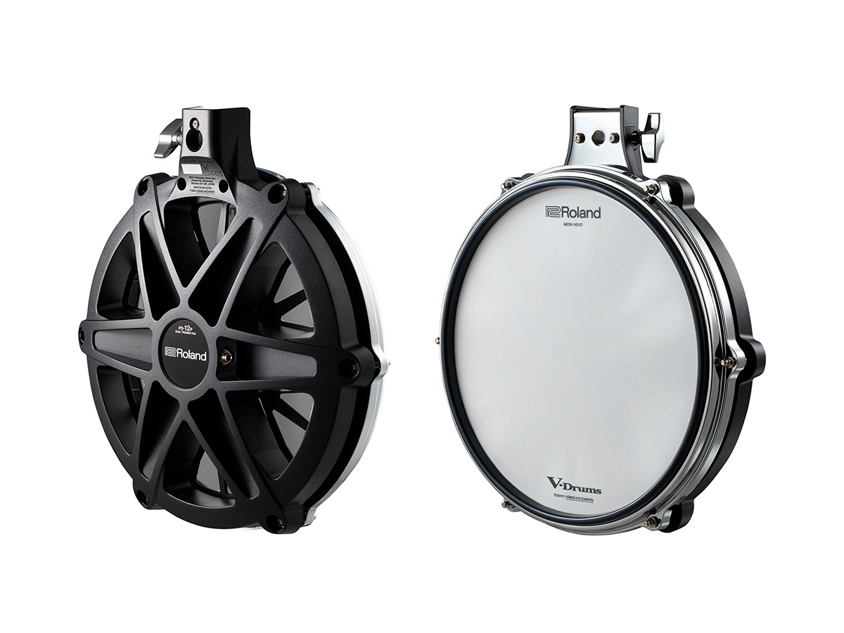 TD716に採用されているPD-12X/PD-10Xのデザイン・コンセプトを継承した、12″と10″の薄型パッド。3基のピエゾ・センサーを搭載し、ホットスポット(センサーの真上を叩いたときに、意図しない大音量が出てしまう現象)の改善とレスポンスの向上を両立している。クローム仕上げのダイキャスト・フープに内側からハード・ラバーをセットすることで、より自然なリム・ショットの感覚が得られるのも特徴だ。
