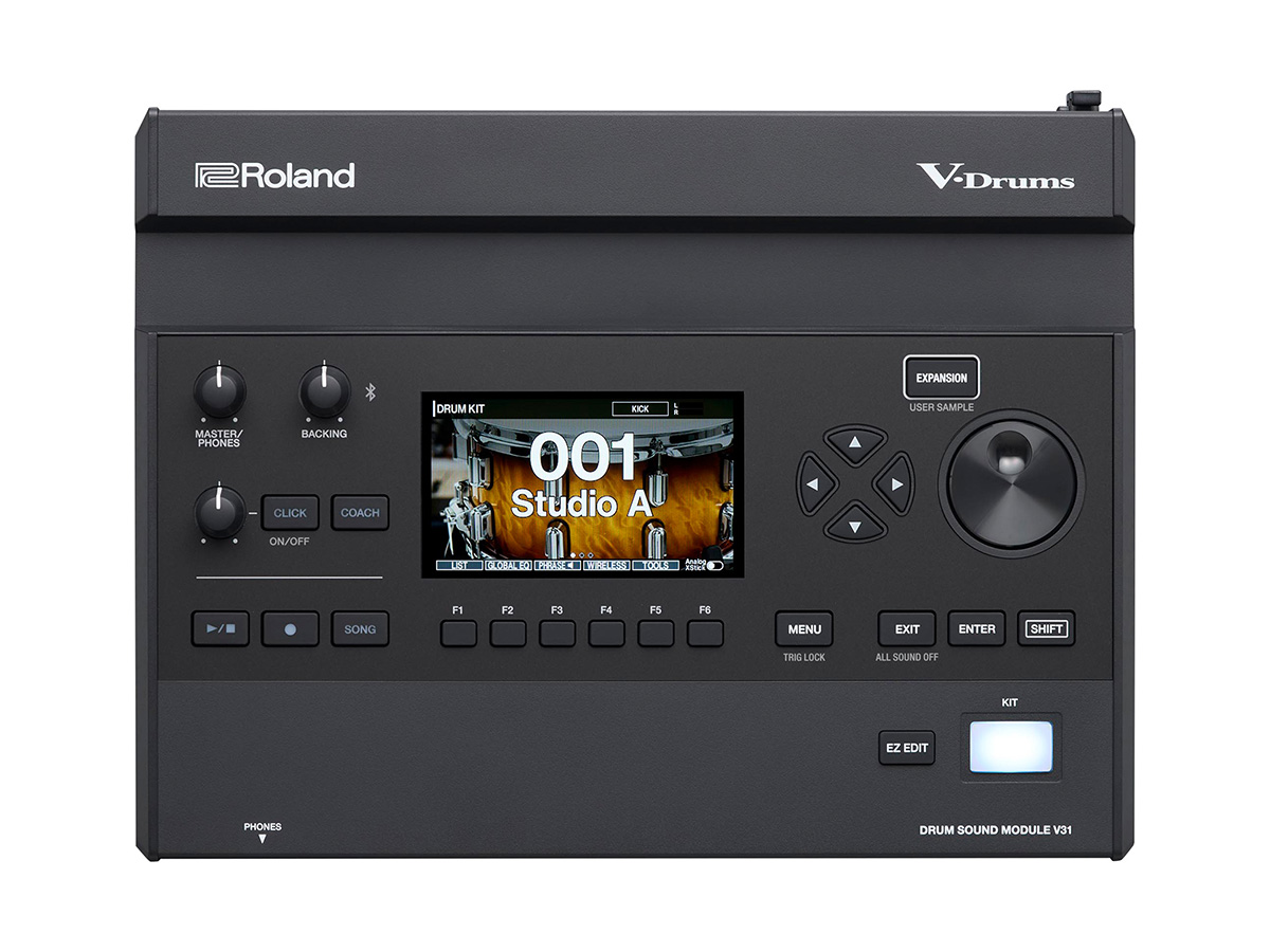 こちらもV71と同じサウンド・エンジンを搭載した音源モジュール。V51との違いはパネル上の操作子がシンプルに整理されている点や、入出力端子の数などで(DIRECT OUTはなく、DIGITAL TRIGGER INは1系統)、それ以外の核となる部分は共通している。新機能が追加されたコーチ・モードもV51と同様だ。なお、今回登場したV51/V31とフラッグシップ機V71はシステムが互換性を持つように共通化され、Roland Cloudを通じて提供されるサウンド・ライブラリーV-Drums Instrument ExpansionとKit Packも同一のものを使うことができる。