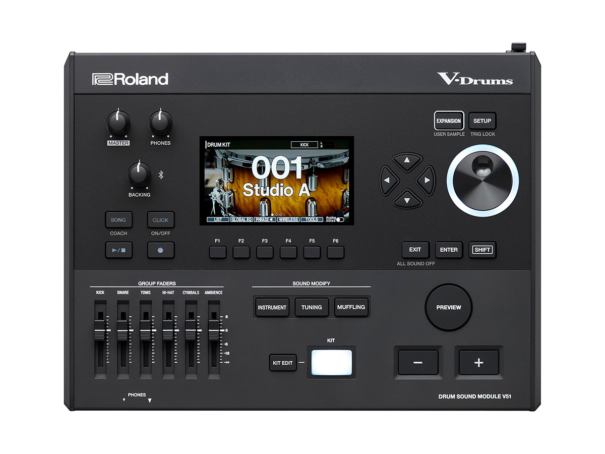 高い表現力を持つフラッグシップ音源V71と同じサウンド・エンジンを搭載した、ミドル・クラスの音源モジュール。DWとの共同開発で生まれた高品位なサンプリング・サウンドに、ローランド独自のモデリング技術Behavior Modeling Technologyが加わり、極めてスムーズで自然なサウンドを実現している。ディスプレイにはV71と同じ4.3インチ・カラーLCDが採用され、機能的に配置されたボタン類や6本のフェーダーとの組み合わせで快適な操作が可能。パッドを叩かずに音色を確認できるPREVIEWボタンも装備された。