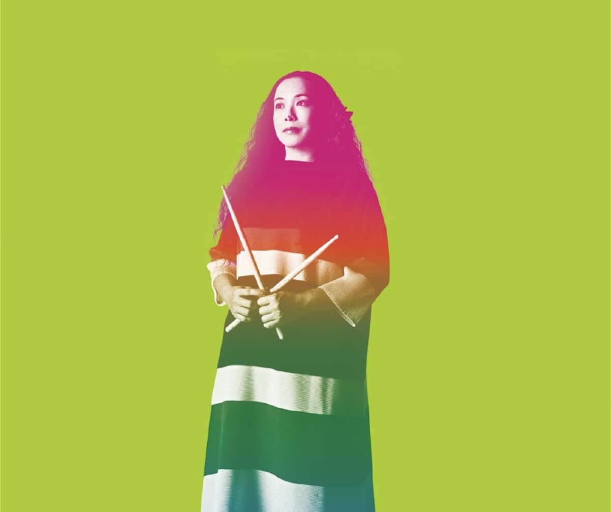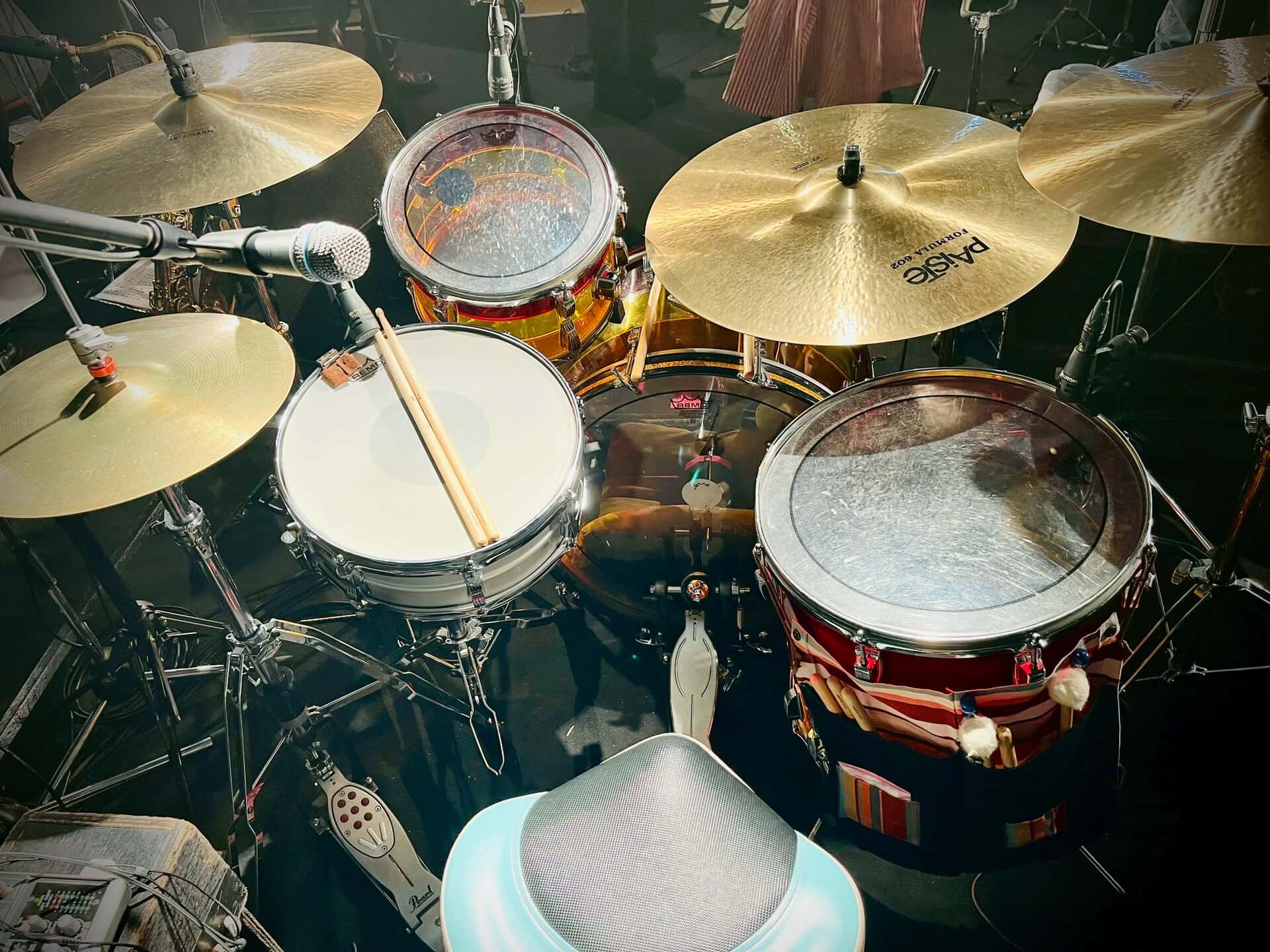 • 2025年末には渋谷クラブクアトロで発売記念ライヴも開催。REIKOのセットアップは、70年代ラディックのビスタライト(テキーラ・サンライズ)に同じく70年代のジルジャン・ニュービートとパイステFomula 602を組み合わせたシンプルな3点セット。