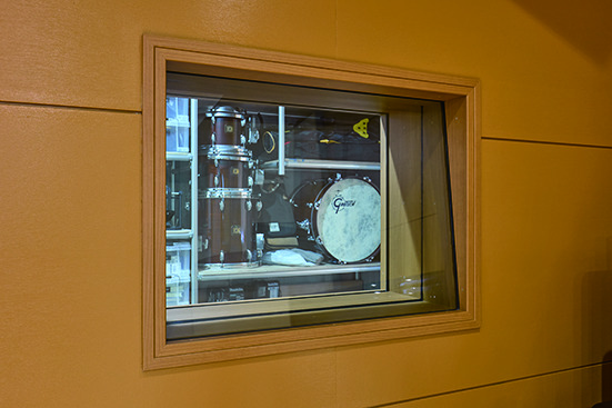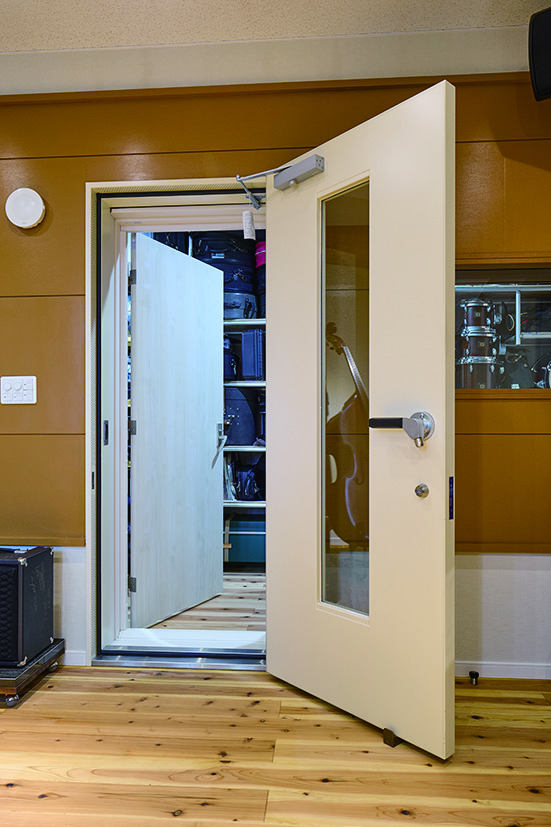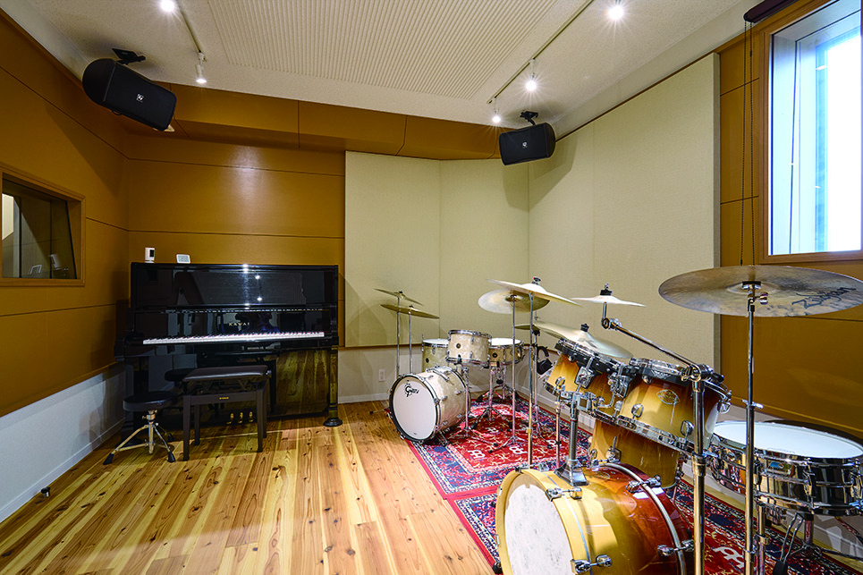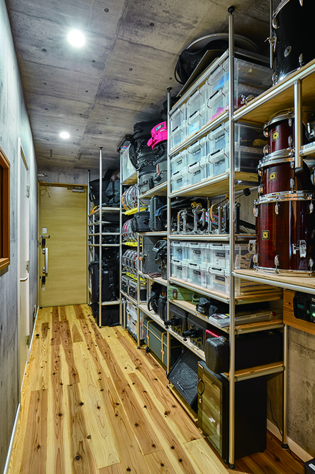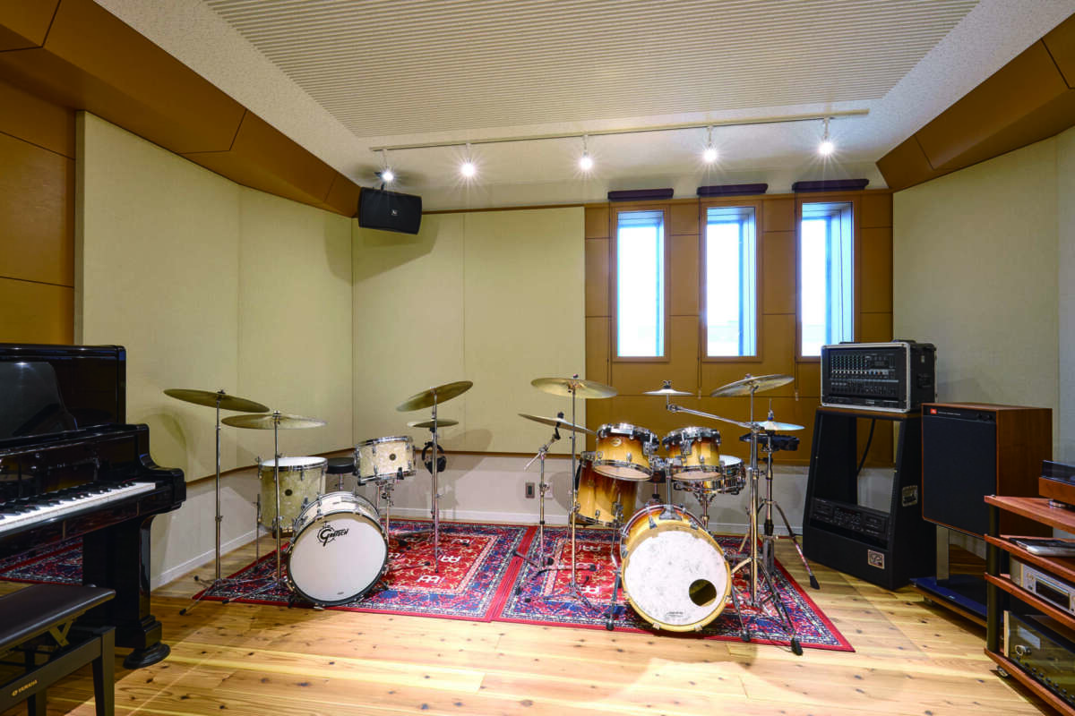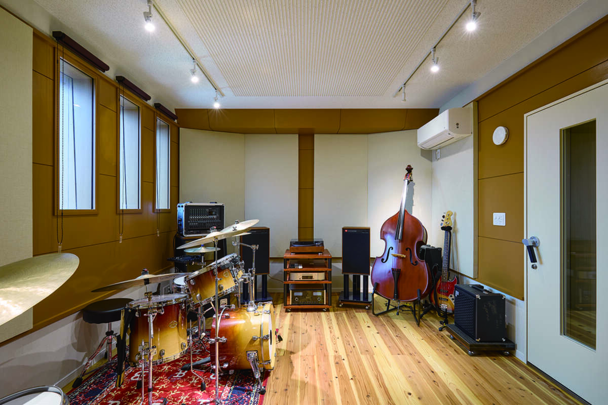 「居住スペース側の床は杉の無垢フローリングなんですけど、良い響きが得られるかもしれないということでスタジオの床にも同じものを採用しました。実際とても良い感じになり、ドラムを叩いていてもすごく気持ち良いんです。セッションなどのときはドラムセットを外に持ち出すんですけど、この部屋で叩くときが一番気持ち良くて、ずっと叩いていたくなります」