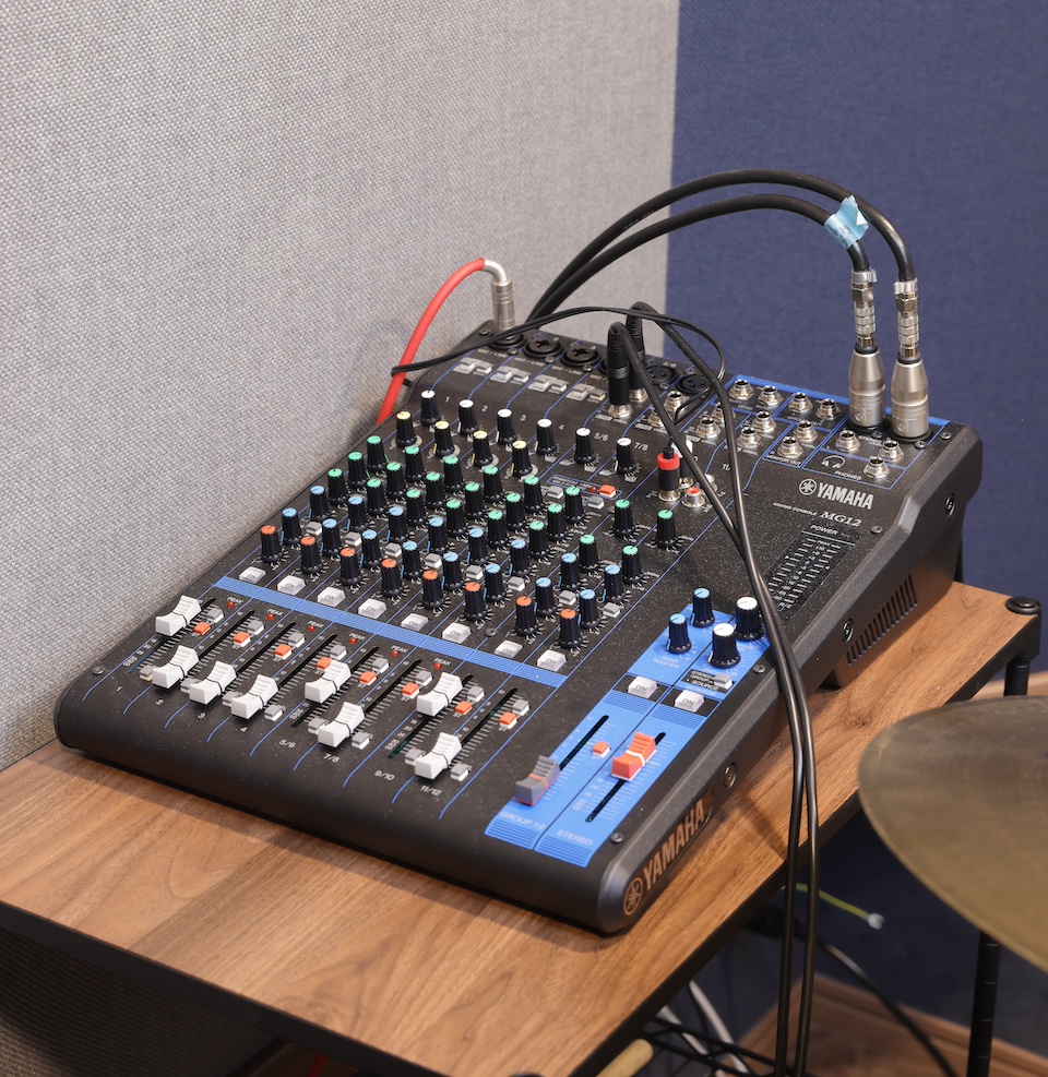 コンパクトなPAミキサーはYamahaのMG12。ヴォーカル・マイクや、ドラム練習時の音源再生などのために使用。