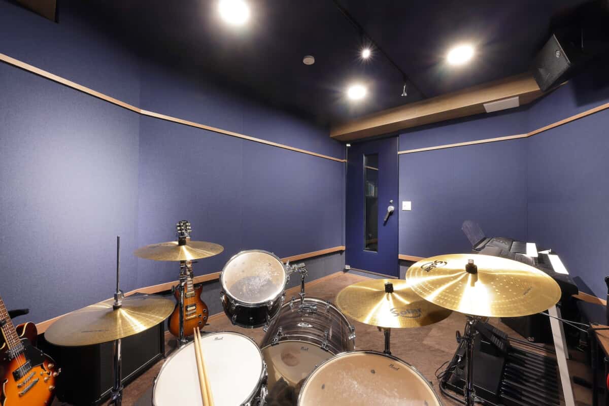 ドラム側から見たスタジオの様子。バンドで音を出すには十分な広さだ。