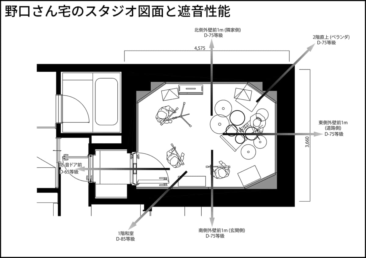 夫「遮音性能を測定してもらったときの数倍大きい音を出しています(笑)。それでも性能の範囲内で、家の外で聴いていると、中でドラムを叩いているなんてわからないと思います」