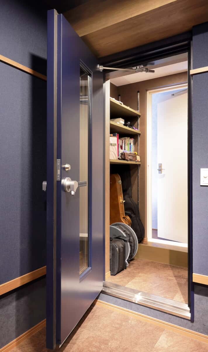 2枚の防音ドアの間には大きめの空間を設け、収納棚を置いた“前室”として使用。これも居住スペースへの遮音性能に寄与している。
