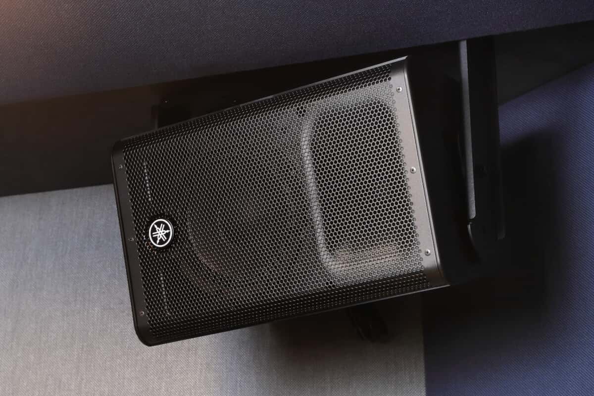 天井から吊られたYamahaのスピーカー。これまで多くの住宅スタジオで導入していたスピーカーの吊り金具が入手できなくなったため、床置きにすることも検討されたが、バンドで演奏するスペースを確保するにはやはり天吊りが良いということで採用となった。