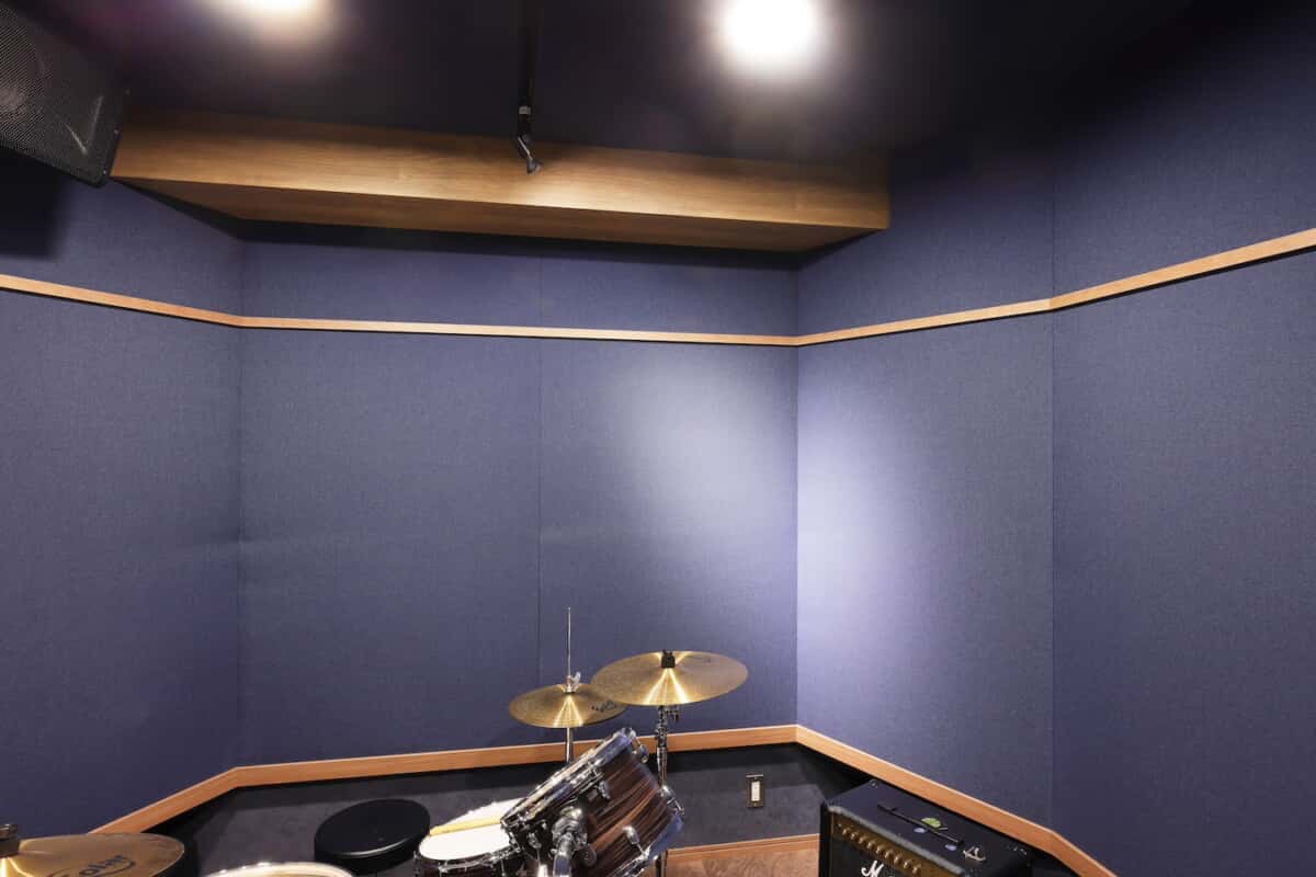 壁の全方向と天井の大半を吸音パネルで仕上げてしっかり吸音。梁のように見える部分には換気用のダクトが通っており、木目入りのクロスを貼ることで内装のアクセントにもなっている。