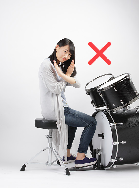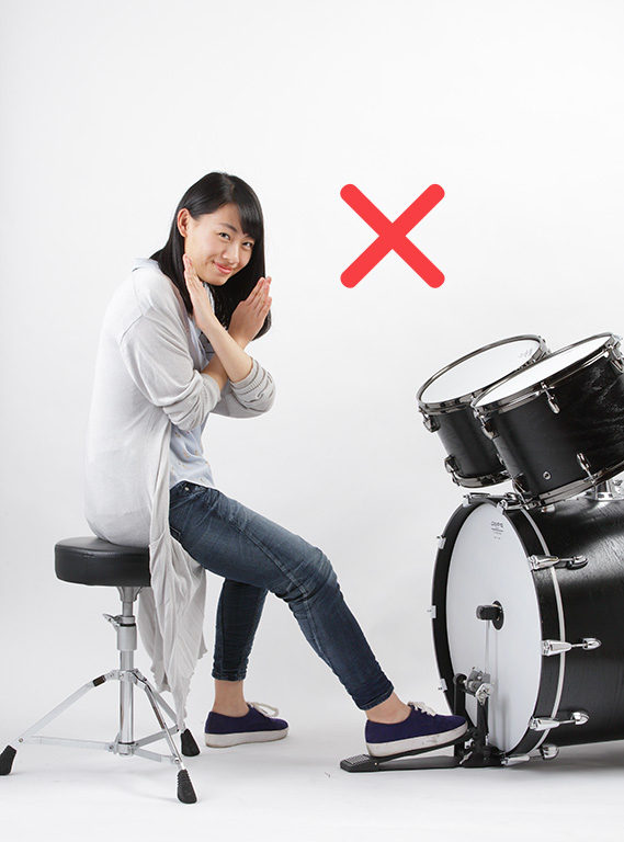 写真のように近すぎたり、逆に遠すぎるのはNG。ただし、椅子の高さや距離などは、ドラマー個々の体格やスタイルによって正解が異なります。これはあくまでも“スタート位置”ということで、経験を重ねていく中で自分にとって最適な正解を見つけてください。