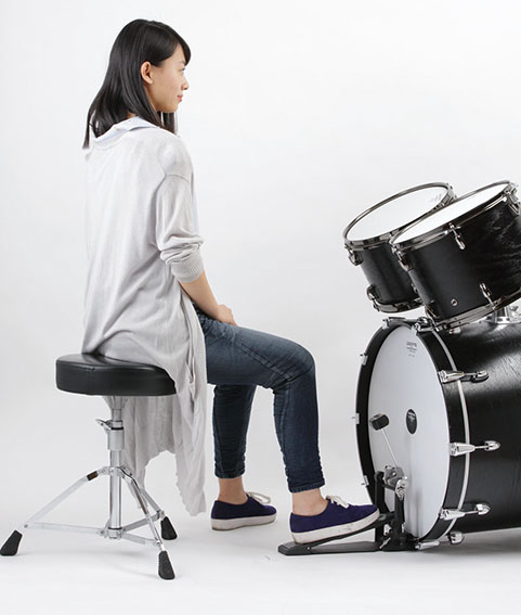 A.1 初めてドラムに向かうときは、まずイスの高さやバス・ドラムとの位置関係を決めてみます。上の写真のように、イスの高さは座った際、膝部分がやや下に向く角度になるように調整してみます。そして椅子のやや前方に座った状態でペダルに足を乗せ、膝頭の真下にカカトが来るような距離で座るのを基本にします。