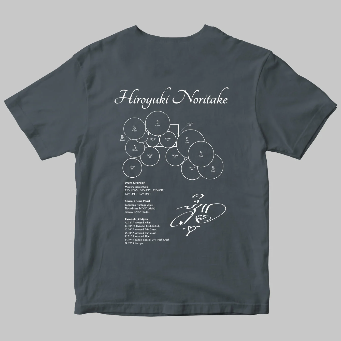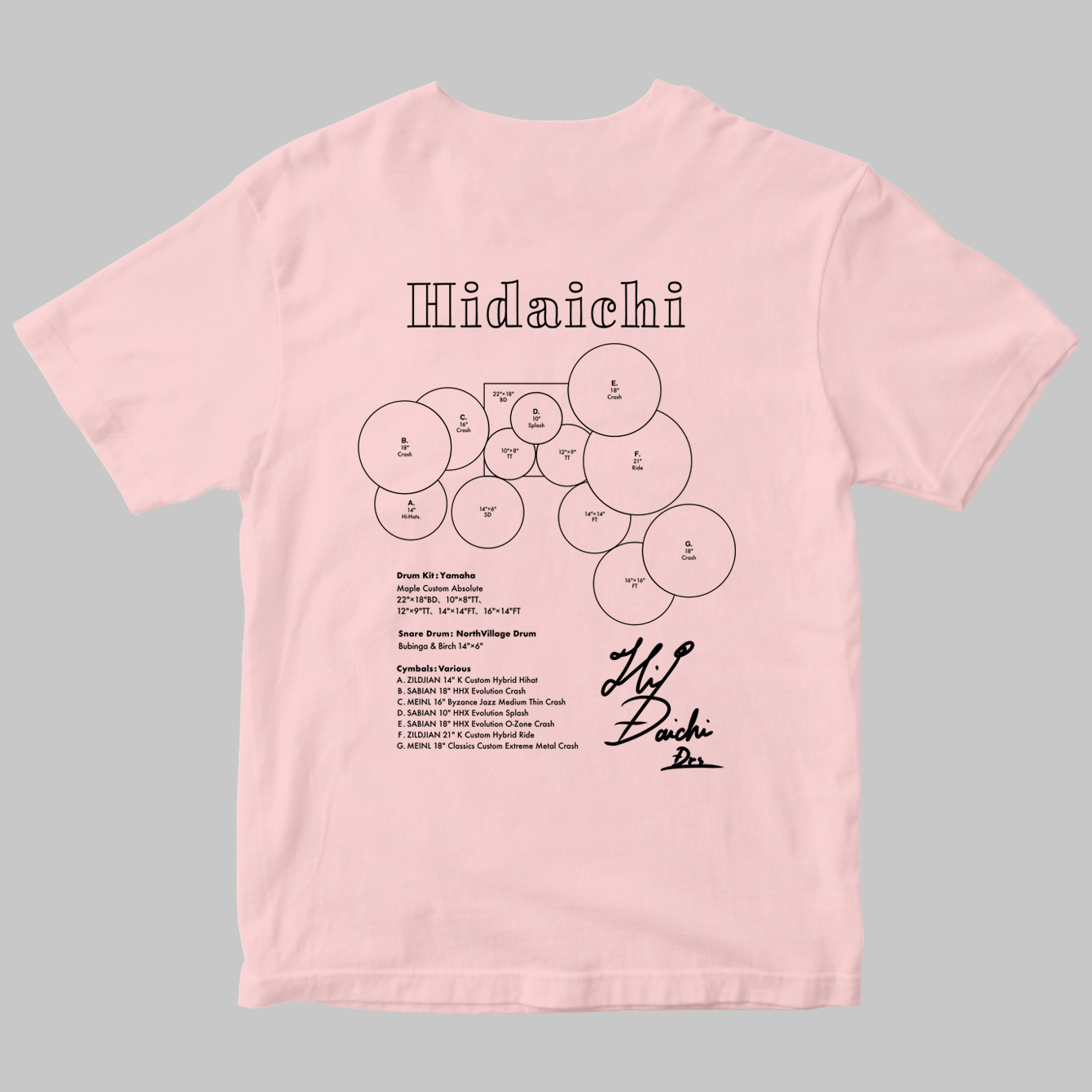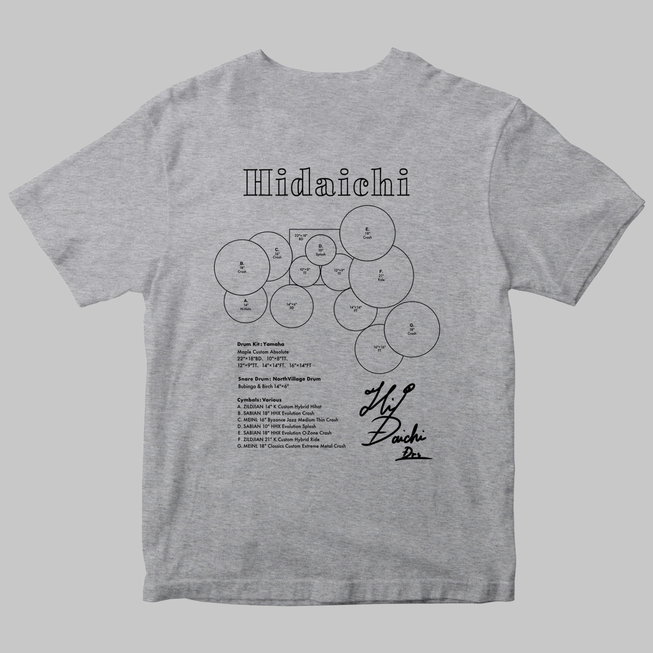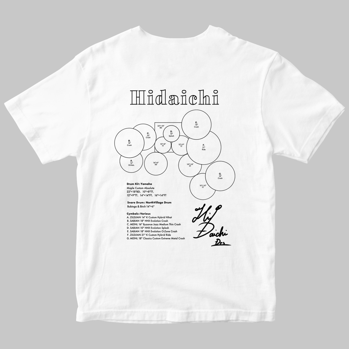 歌い手ユニット=いれいすのバックを務め注目を集めるドラマー、肥田大地。彼が初めて購入したドラム・セットで、現在もメイン機として活躍する“相棒”=Yamaha Maple Custom Absoluteのセット図Tシャツが完成! 背面のロゴは愛称である“ひだいち(Hidaichi)”をプリントしました。