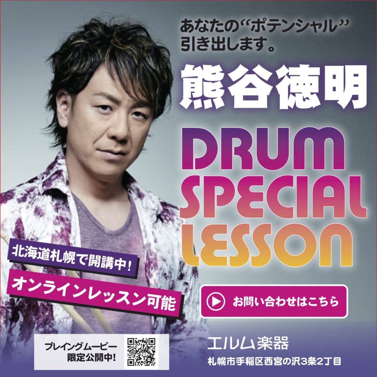 多くのステージで輝きを放ち、第一線で活躍中の「熊谷徳明」が直接指導するドラマーのための特別レッスンが、北海道札幌市のエルム楽器本社センターで展開中。基礎から学びたい方から、自身のプレイに幅を持たせたい上級者まで対応。テクニックアドバイスはもちろん、長年プロの世界で培った現場目線、俯瞰的目線の極意を惜しみなく伝授。個人に即したレッスンで、貴方のポテンシャルを引き出し、あなたの演奏を次のレベルへ導きます。