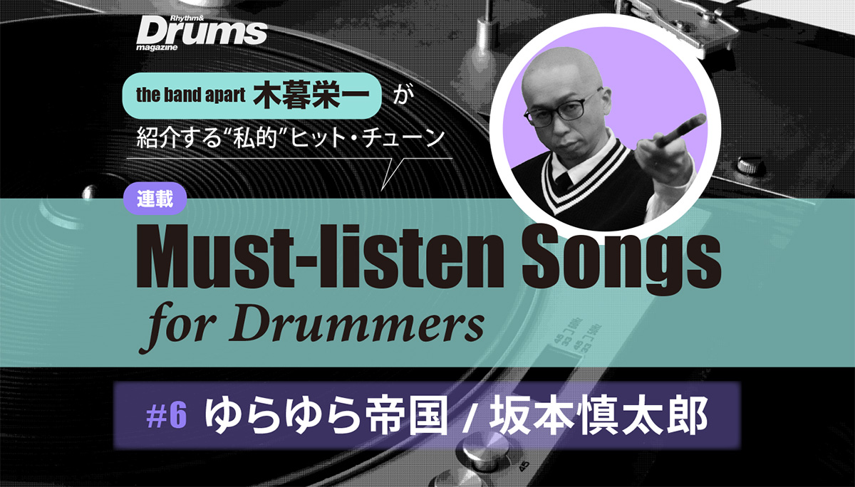 the band apartのサウンドの屋台骨を担う木暮栄一が、ドラマー/コンポーザー的視点で読者にお勧めしたい“私的”ヒット・チューンを紹介していく本連載。第6回では、独自のバランス感覚でサイケデリックを追求し、後進のロック・ミュージシャンに影響を与えたバンド=ゆらゆら帝国、そして2011年のバンド解散以降ソロ・アーティストとして活躍する坂本慎太郎の楽曲をピックアップ!