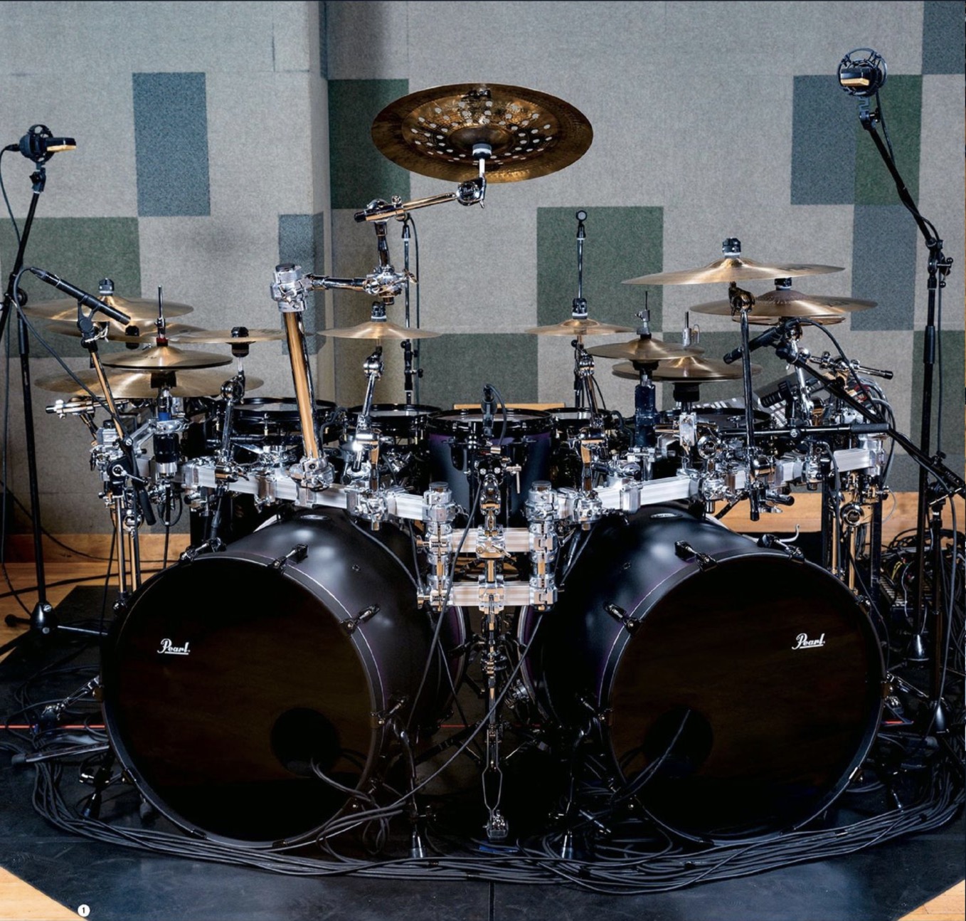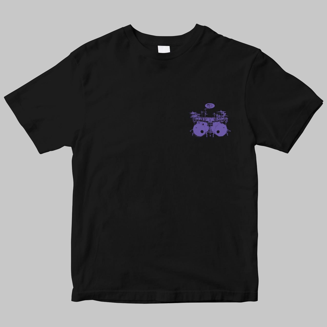 Tシャツに落とし込んだドラム・セットは、yukihiroが2024年に導入した、Pearl Masters Maple。マットブラック×パープルのグラデーションが美しいこちらのキットに、ラックシステムでセイビアンのシンバル13点、レモのロートタムを組み込んだトレードマークの要塞ツーバスセッティングを、yukihiroによる監修のもとセット図化しました。