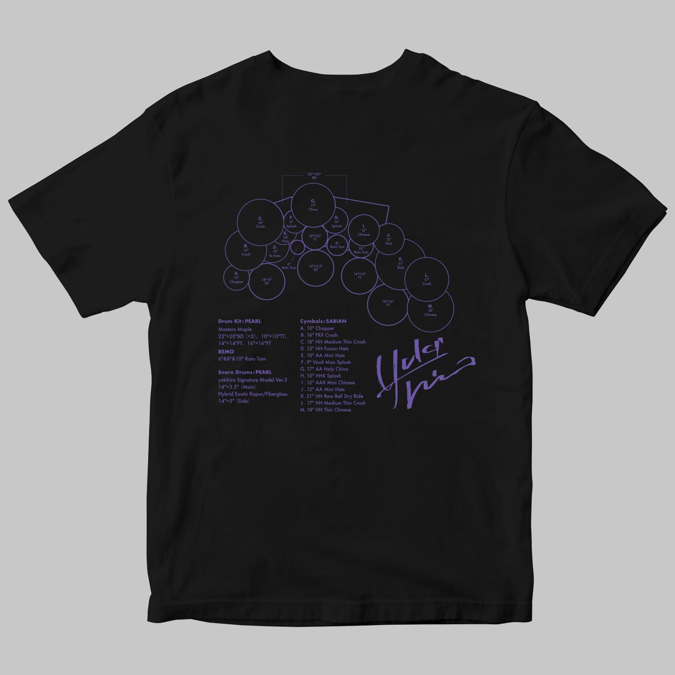 Tシャツのフロントには、ドラムセット前面の実写切り抜き画像をワンポイントでデザイン。バックには、セッティングの詳細に加えて、yukihiro本人のサインもレイアウトしています。