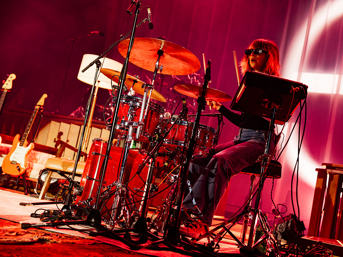 ダイナミクスに富んだドラム・アプローチで楽曲を彩るロニーが来日中に使用したドラム・キットは、ダーク・ブラウンのカラーリングが上品なTAMAのSTAR Maple。こちらはTAMA Drumsからのレンタル品で、1バス、1タム、2フロア・タムというキット構成に、ジルジャンK Constantinopleシリーズのライドを主体としたシンバル4点を水平にセッティング。ロニーによると、「リムを使った音色が出しにくくなるのを避けるため、タムには角度をつけないのがこだわり」とのこと。ドラム・スローンを64cmという高さにセッティングしているのも特徴の1つ。スネア・ドラムは、TAMAのSTAR Reserve Maple(14″×5″)で、基本的にはハイ・ピッチにチューニングして使用しているそうだ。フット・ペダルは、TAMA Iron Cobra(Power Glide)のシングル・ペダルで、スティックは、ヴィック・ファースのExtreme 5A(14.4mm×419mm/ヒッコリー)をチョイス。