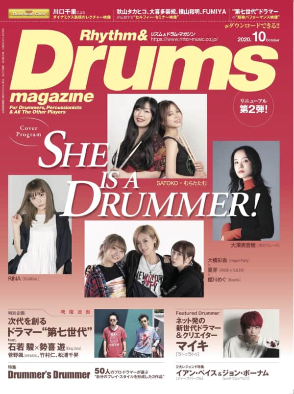 本編となるリズム&ドラム・マガジン20年10月号では、堀が所有している4台のドラム・キットと、12台のスネア・ドラムを6ページに渡って詳しく紹介! アコースティック・ドラムと電子楽器の融合に関する独自の方法論などを語る永久保存版の1冊です!!!