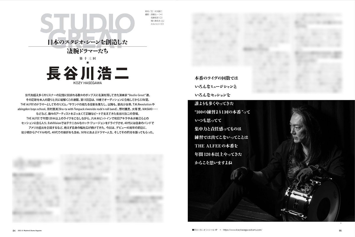 Profile●はせがわこうじ:1965年生まれ、神奈川県出身。小学生でドラムを始め、高校3年生の18歳のときにTHE ALFEEのドラマー・オーディションに合格。以降、2005年までバンドの屋台骨を支えた。卒業後は筋肉少女帯、T.M.Revolutionなどのサポートでも活躍。Battle Cryや自身のバンド=CUBE=RAYも始動させた。ベーシスト、永井敏己によるTOSHIMI SESSIONではインスト・ナンバーでもプレイしている。12月17日はデビュー記念日。