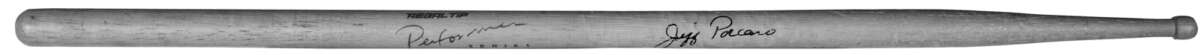 形は現在市販されているモデルとほとんど変わらないが、誤差の範疇で微妙に細めな気もする。また現在のシグネチャー・モデルはラッカーを塗らない仕上げであるが、こちらはわずかに特殊な塗装が施されているようで、しっとりと手に吸いつくような感触があった。そして最も気になる重さは49g。スティックのピッチは“コンコン!”という素直な響きであるが、高域が特に良くヌケるという印象ではなかった。木目はグリップからチップまで真っすぐに綺麗に通っている。スティック中央のオープン・リム・ショットによる痕と、ショルダーについたハイハットの極繊細な傷からタッチの違いも推し量れる。