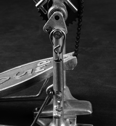 またビーターの角度を浅めに設定するのもジェフ流で、上写真は4段階のタイプの固定位置を2つ目に設定した状態。ジェフ自身も1990年のインタビューで「スプリングの固定位置を1か2にする」と語っている。ビーターはRogersの2ウェイ・ビーターを樹脂面にして使用。これは重量が82gと、DW純正の100g前後と比べて軽く、それがRogers製ビーターにこだわり続けた理由でもあると考えられる。