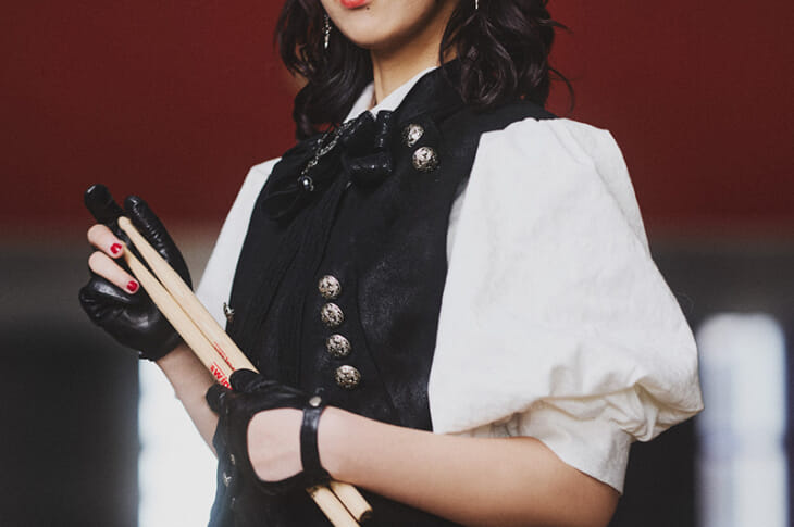 安定感抜群の高速ツーバスを駆使したドラミングで、数多のプロジェクトに参加し、海外でも高い評価を得る青山英樹。さまざまなライヴ/レコーディングで活躍する彼のメイン・キットは、ヤマハのRecording Custom。2バス、3タム、2フロア・タムという不動のセッティングで、8"〜16"と2インチずつ口径が大きくなる王道のサイズ構成だ。クールなルックスが目を引くカラーは、特注のディープ・ブルー。エンブレムには青山の名前が刻まれている。シンバルはパイステで、シグネチャー・シリーズを中心に構成。セッティングは水平で、2枚のクラッシュを除き、全体的に低めの配置となっている。豊富な手数&足数を駆使するスタイルということで、シンバルを含めて点数は多いが、隙間なくコンパクトにまとまっている点が特徴。