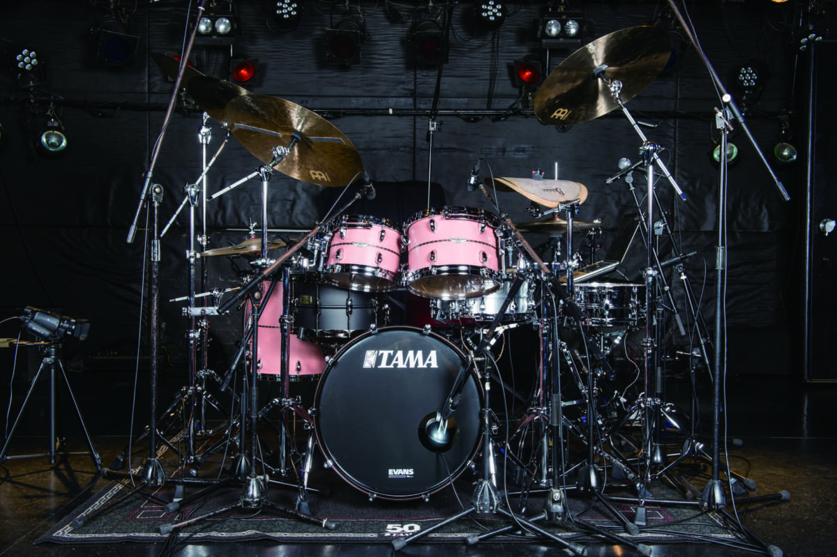 一方のアニカの使用機材は1バス、2タム、1フロア・タムのスタンダードな組み合わせが基本。しかし3月に行われたイベント出演時の映像を見ると、1バス、2タム、2フロア・タムに加えて、左手側にシングル・ヘッド・タムを4発、右手側にゴング・バスを配置するなど、大幅にセット・チェンジ。緻密な楽曲を表現するための”ラッシュ仕様”になっている点が特徴的だ。