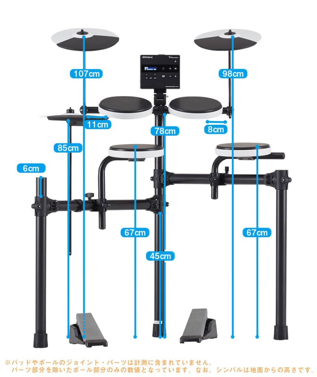 ここではRolandVドラムのエントリー・モデルのTD-02Kと、Yamaha DTXシリーズのエントリー・モデルであるDTX402KSを、筆者がアコースティック・ドラムを想定してセッティングした際の数値を目安として記してみました。初心者が座った際には、パッド類が少し離れている印象を受けるかもしれません。もちろん高さなどは身体の大きさによっても変わるので、すべての人にベスト・マッチするというわけではありませんが、1つの指針として役立ててもらえると良いと思います。