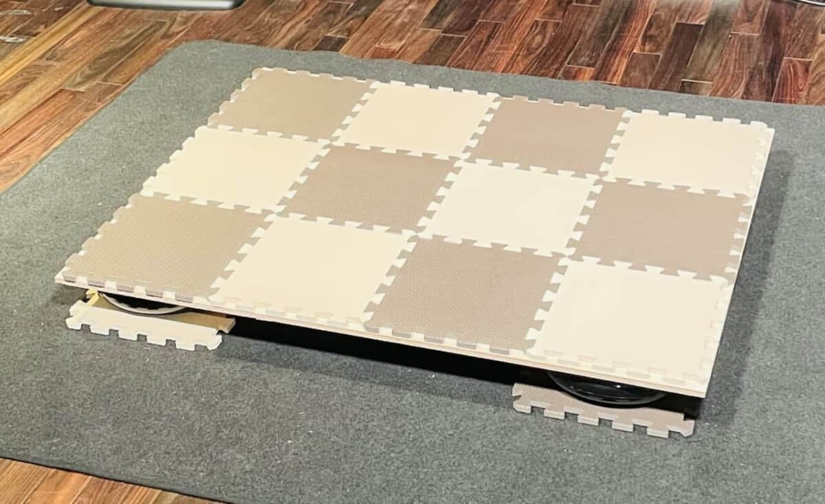 ちなみに筆者の場合は、使わなくなったダンベル用のウエイトを12キロほど乗せていますが、これは水を入れた2リットルのペットボトルを5~6本置くことでも代用できるでしょう。それでも揺れは完全には抑えられませんが、私の場合は使用しているうちに慣れてしまい、さほど気にならないレベルになりました。また、台となる板が薄いと、しなりが生まれて揺れやすくなることも考えられます。筆者は12mmの合板を使用していますが、12~15mmくらいがオススメだと考えています。