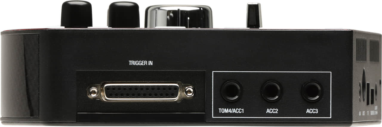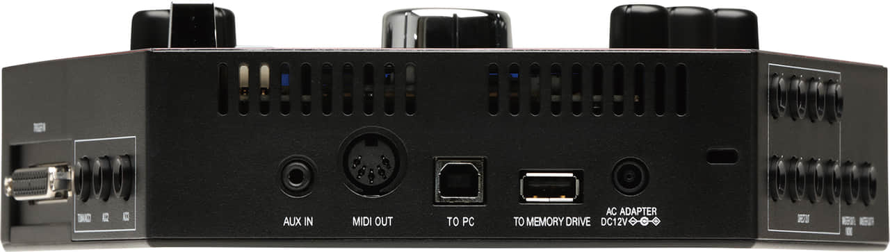 【接続端子】MASTER OUT L/MONO、R端子(標準フォン・ジャック、アンバランス)、DIRECT OUT 1~8端子(標準フォン・ジャック、アンバランス)、HEADPHONES OUT(ステレオ標準フォン・ジャック)、AUX IN(ステレオ・ミニ・フォン・ジャック)、TRIGGER IN端子(D-sub25ピン)、ACC INPUT端子×3(TOM4/ACC1、ACC2、ACC3、TRS標準フォン・ジャック)、TO PC端子(USB B端子)、TO MEMORY DRIVE端子(USB A端子)、MIDI OUT端子