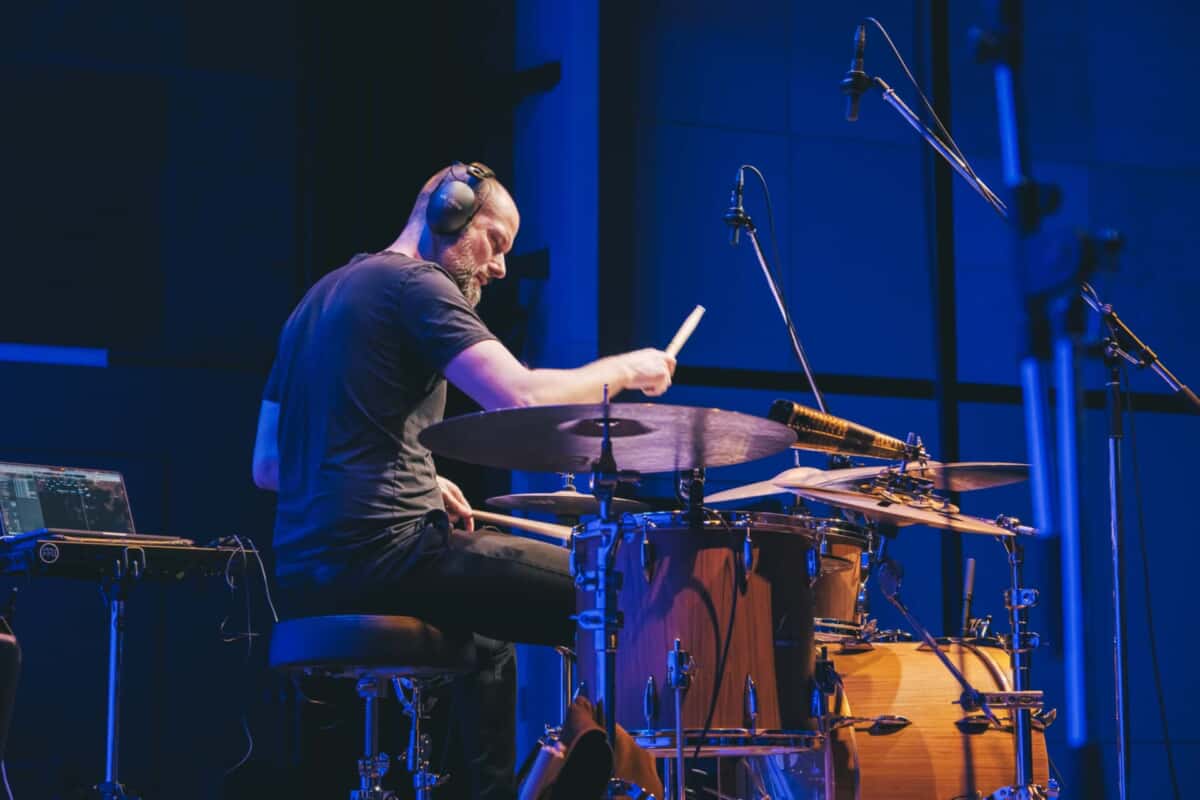 続いてQ&Aに移り、多用していたパーカッシヴな奏法について尋ねられ、“偶然と影響の両方”で身についたと説明。パーカッショニストからの影響と、自身で編み出したこととして、1つのドラムでも鳴らし方次第で音程感を変えられること、弦楽器の発想をドラムに応用していることを語り、こうした表現が可能なのは、生楽器ならではと強調していた。