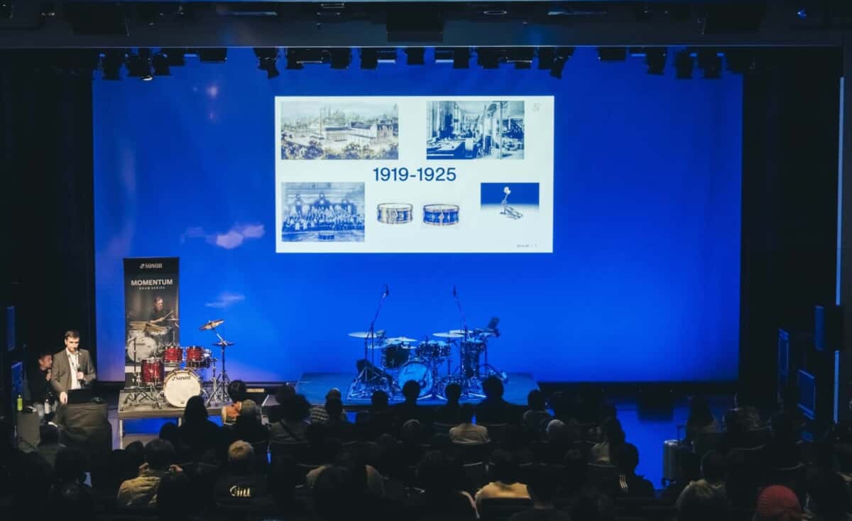 SONORの物語は1875年、ドイツ中東部にあるザクセン=アンハルト州ヴァイセンフェルスの小さな工房からスタート。創業者であるヨハネス・リンクが当時手がけていたのは、太鼓の皮や軍用太鼓といったものだったが、彼の根底にあった“良いものを作りたいという”情熱が、後に150年続くブランド哲学の原点となったと語る。その後、1907年にラテン語で“響き”を意味する“SONOR”商標が登録。同年に当時革新的だったフット・ペダルを考案し、製材所を持つほどに成長。着実にドラム・シーンにおける存在感を高めていったという。