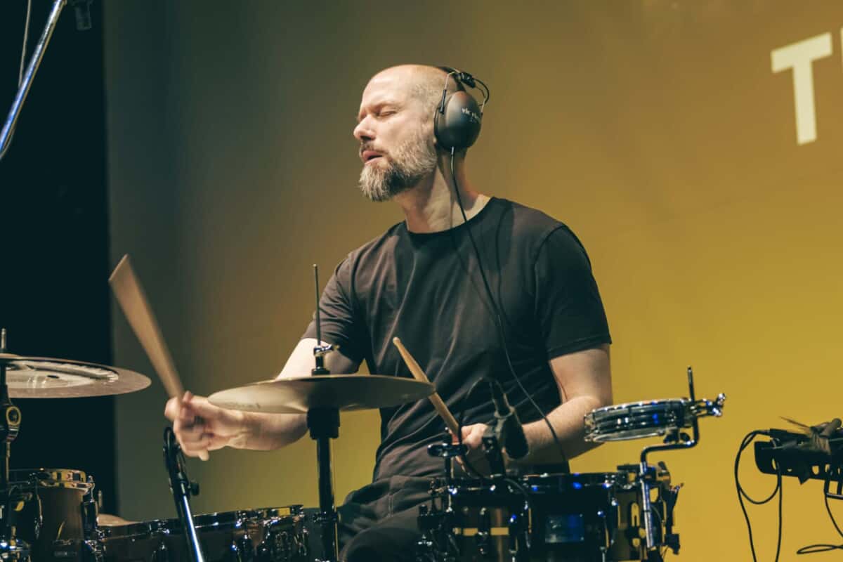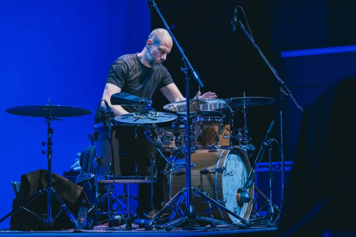 続いて披露された約15分のフリー・ソロでは、会場に独特の緊張感が漂う中、柔軟かつパワフルなストロークで楽器の素直な鳴りを引き出しつつ、シェルを叩くエフェクティヴな奏法や、ヘッドを押さえて音程を変えるチョーキングで、ドラムを瞬時にメロディ楽器へと変貌させる。技巧を誇示するのではなく“音をどう響かせるか”に集中し続ける姿勢が、強い説得力を持つサウンドとして昇華されていた。その後のトークでは、SONORへの感謝と共に、ドラムを叩くことが自分をドラマーとして定義してくれる行為であると語る。「昔はうまくいかないと楽器のせいにしたこともあったが、今はしない。言い訳できないほど素晴らしい楽器だから」……その言葉は、直前の演奏と共鳴し、重みを持って響く。
