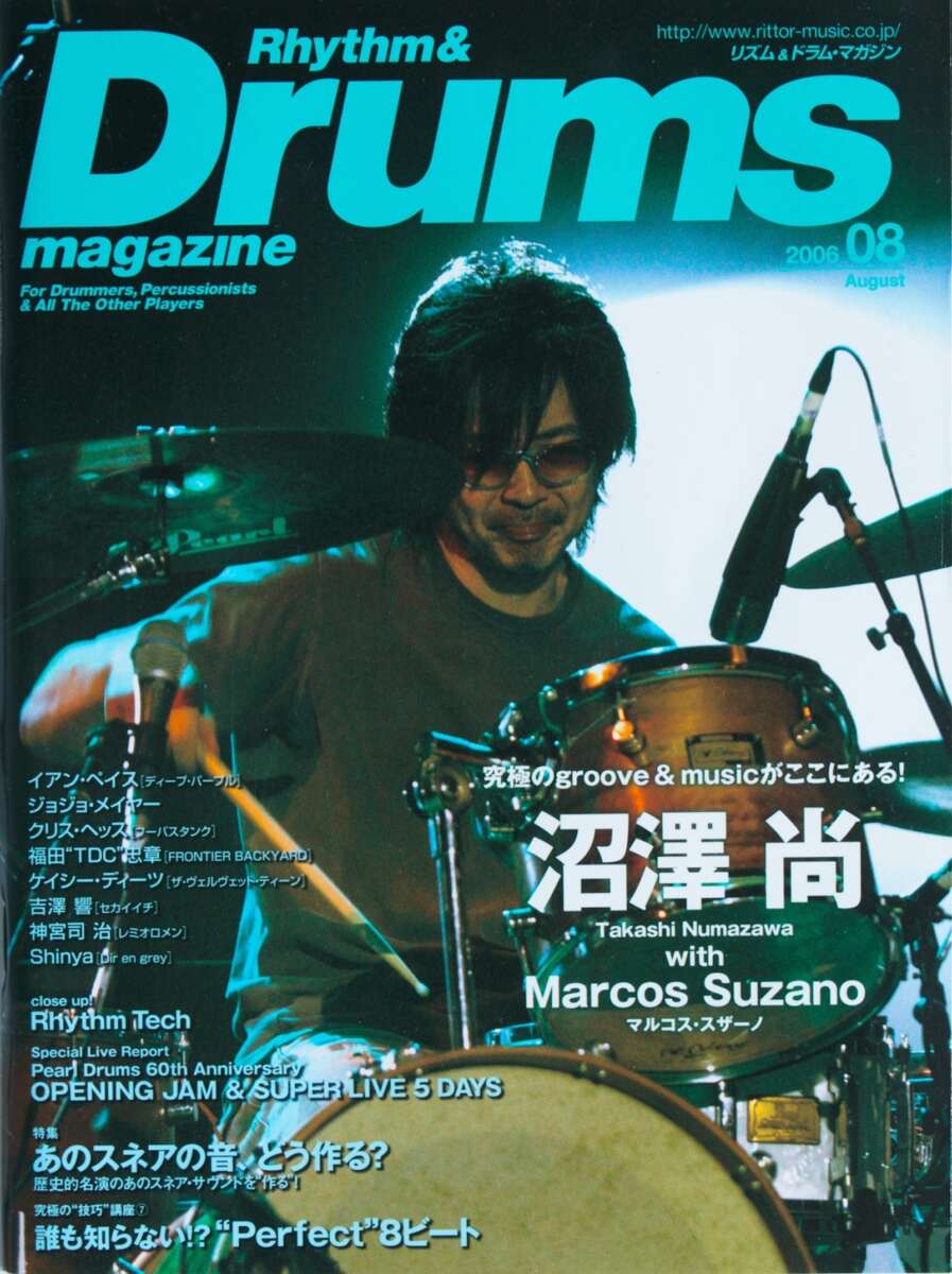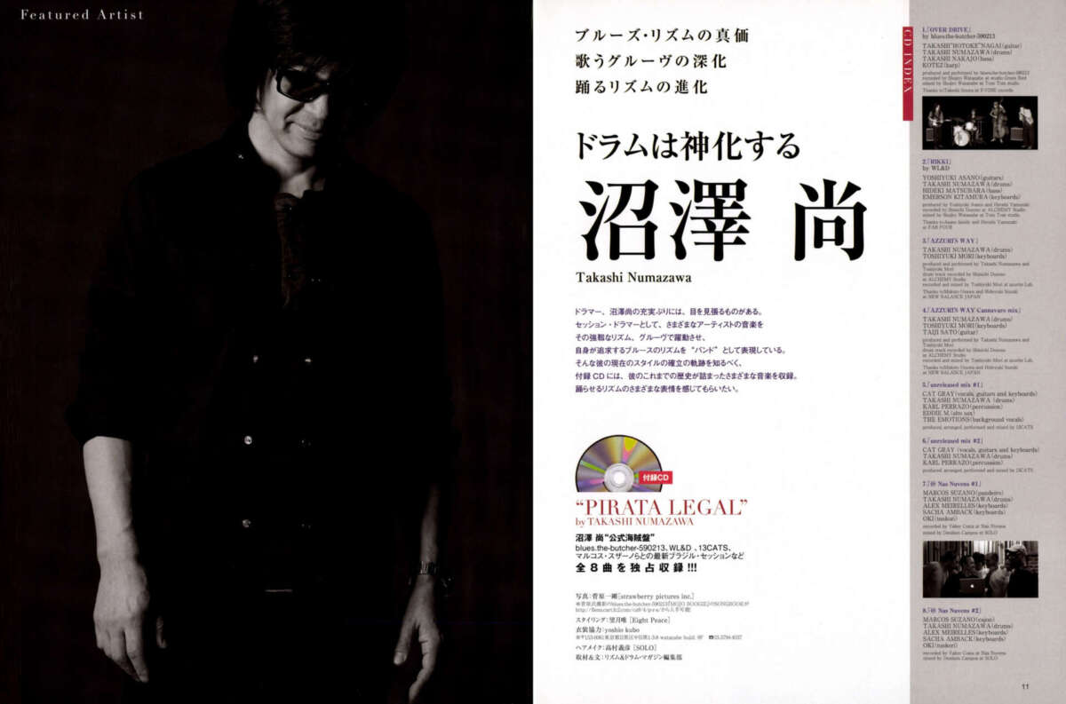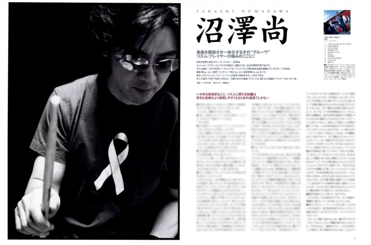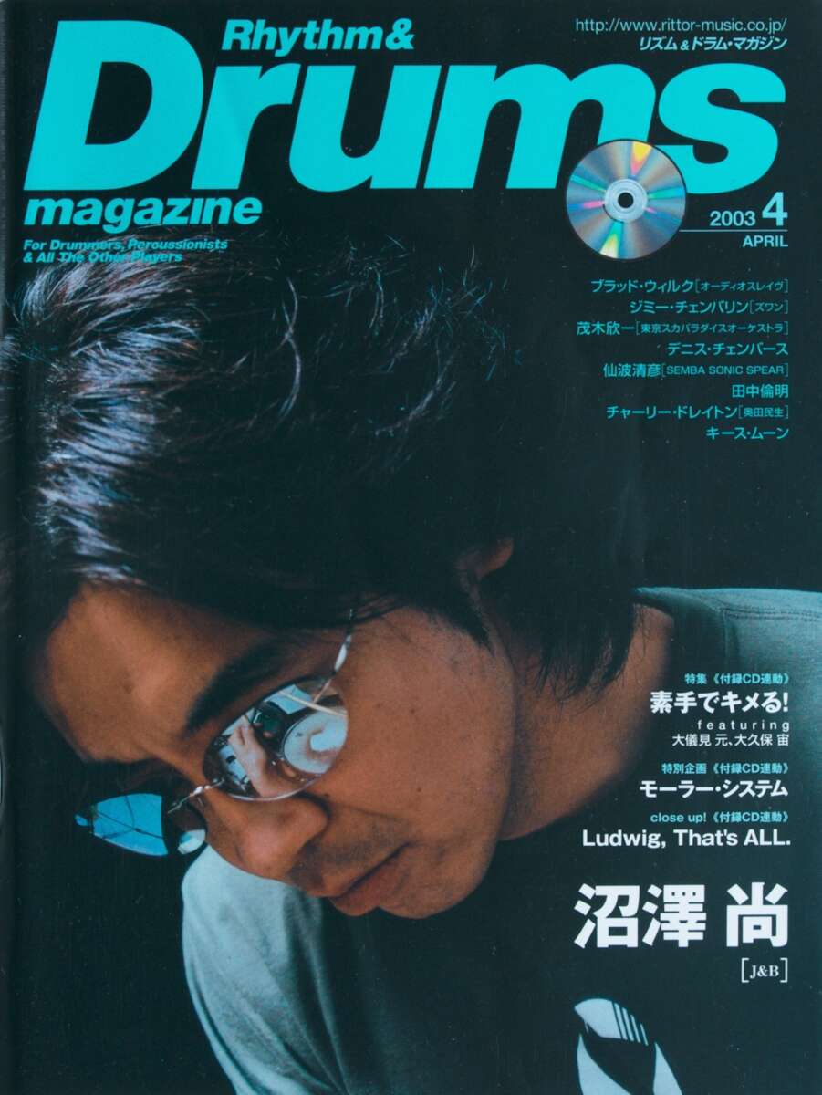 【Note】売れっ子セッション・プレイヤーの集合体バンド、J&Bのメジャー作リリースを機に組まれた2003年4月号の表紙巻頭特集では、“ドラマーである前に音楽ファン”というテーゼから始まり、音楽観&ドラム観に迫るインタビューを展開。特に、バンドとして活動する上での明確な意思を語った発言からは、沼澤のミュージシャンシップの核が見える。アルバム楽曲の自筆譜面&解説、エンジニア/ローディーが語る沼澤サウンドの秘密といったコンテンツにも注目。