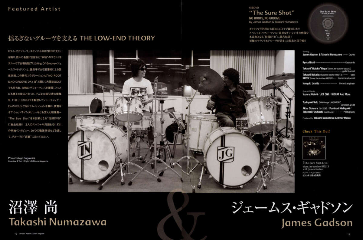【Note】若き日の沼澤がアメリカで学んだ時期の“師”の1人であり、自宅に招かれ練習の日々を重ねた相手が、先日惜しくもこの世を去ったジェームス・ギャドソン。ドラム・マガジン・フェスティバル2012で初めてライヴ共演を果たした際には、2人の対談を軸に全20ページの特集が組まれた(2013年1月号)。曲のリズムを感じて演奏し、共演者に“ポケット”を提示するために大切なものとは?という問いにギャドソンが語ったのは、実にシンプルな言葉だった。