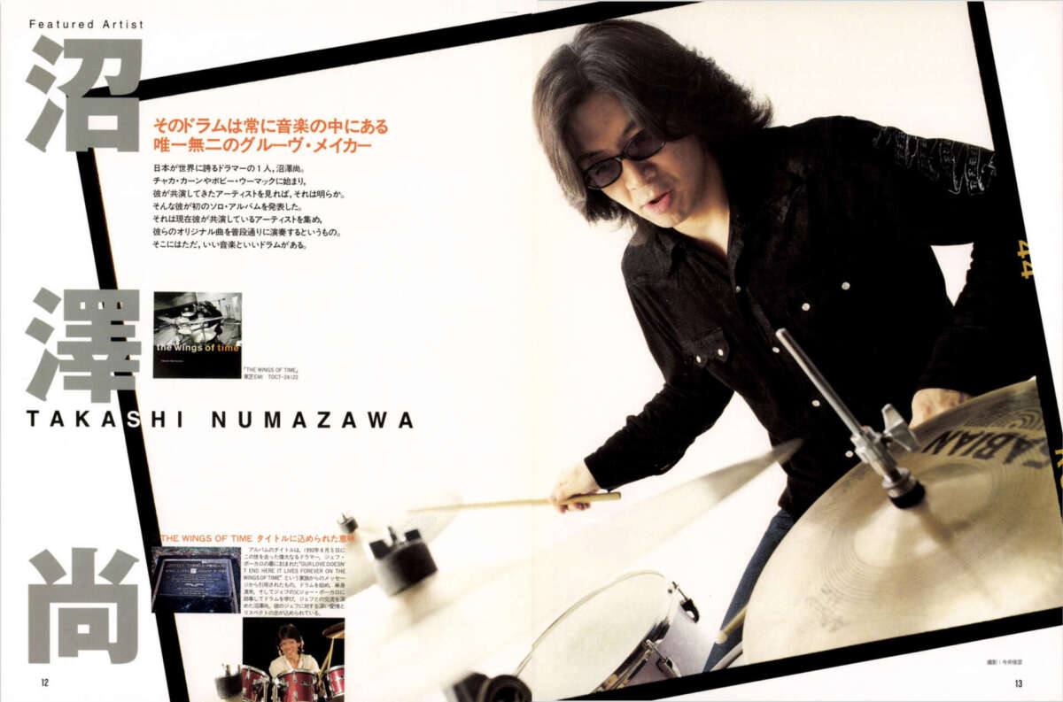 【Note】1999年にリリースされたリーダー作『THE WINGS OF TIME』に合わせて、同年5月号で初の表紙巻頭特集が実現。楽曲ごとに縁の深いミュージシャンを招いたアルバムをさまざまな切り口で深堀りした内容は、昨年サブスク解禁された同作を聴きながら読むとさらに立体的に楽しめるはず。撮影に際しては沼澤自身がカメラマンを指定し、“ドラムを演奏しているところを撮ってほしい”と希望。音楽が聴こえてくるような名カットの数々は誌面でご確認を。