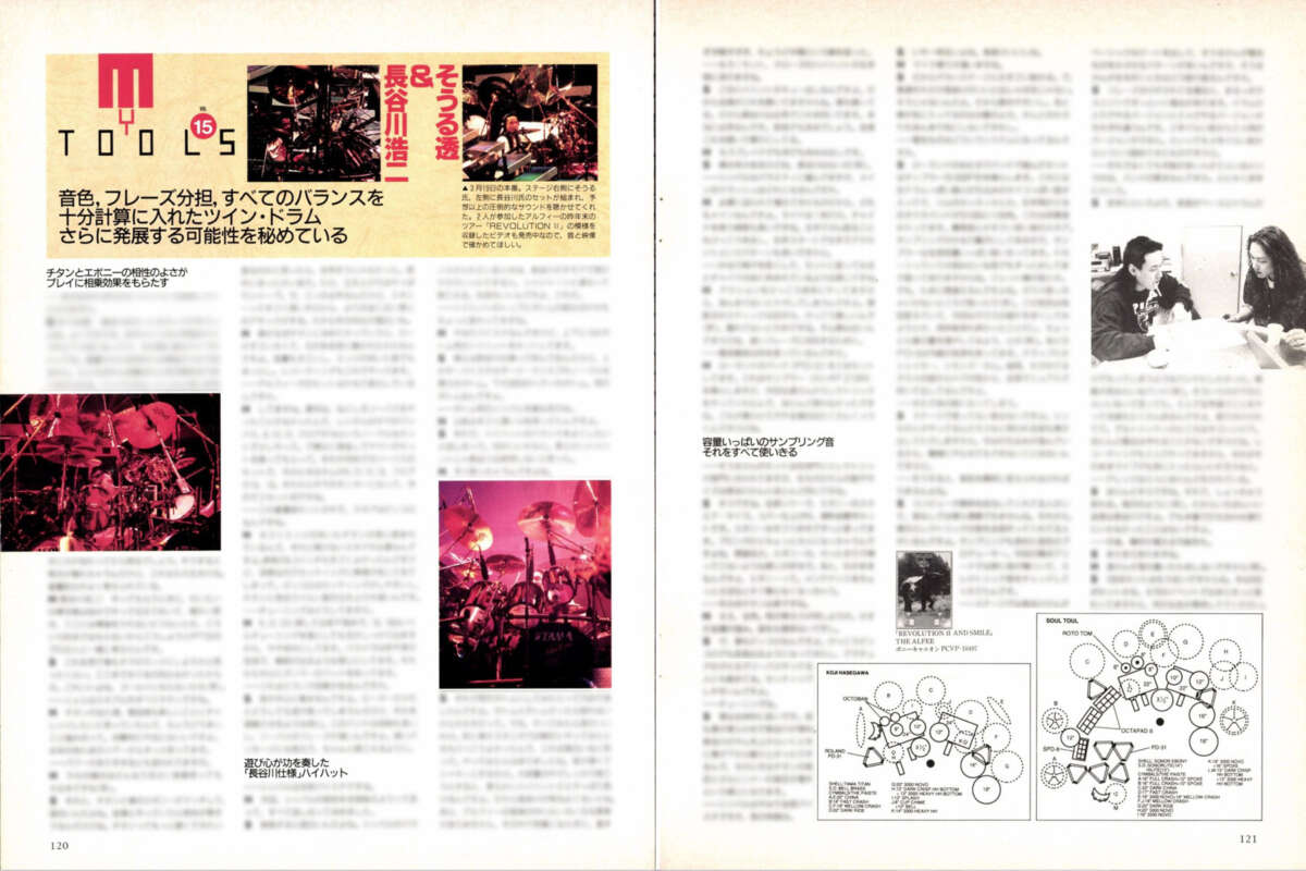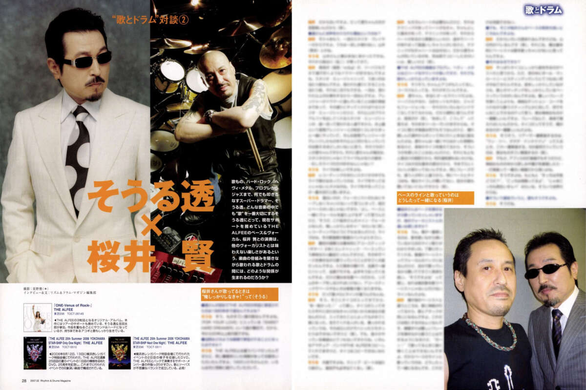 【Note】50年以上のキャリアを誇る重鎮ドラマー、そうる透も、THE ALFEEを語る上で欠かせない存在だ。初期のレコーディングに参加し、以降もツイン・ドラム体制やバンドの転換期など、節目ごとにステージへ関わってきた。長谷川浩二、そして吉田太郎といった歴代ドラマーとの共演も含め、その存在はライヴのダイナミズムに大きな影響を与えた。2007年2月号では“歌とドラム”をテーマに、ベース&ヴォーカルの桜井賢との対談も実現。ドラマーとヴォーカリストの関係性について語られたその言葉は、THE ALFEEのサウンドの根幹を理解するヒントにもなっている。また、1991年にはお互い愛用する機材について長谷川との対談も掲載された。