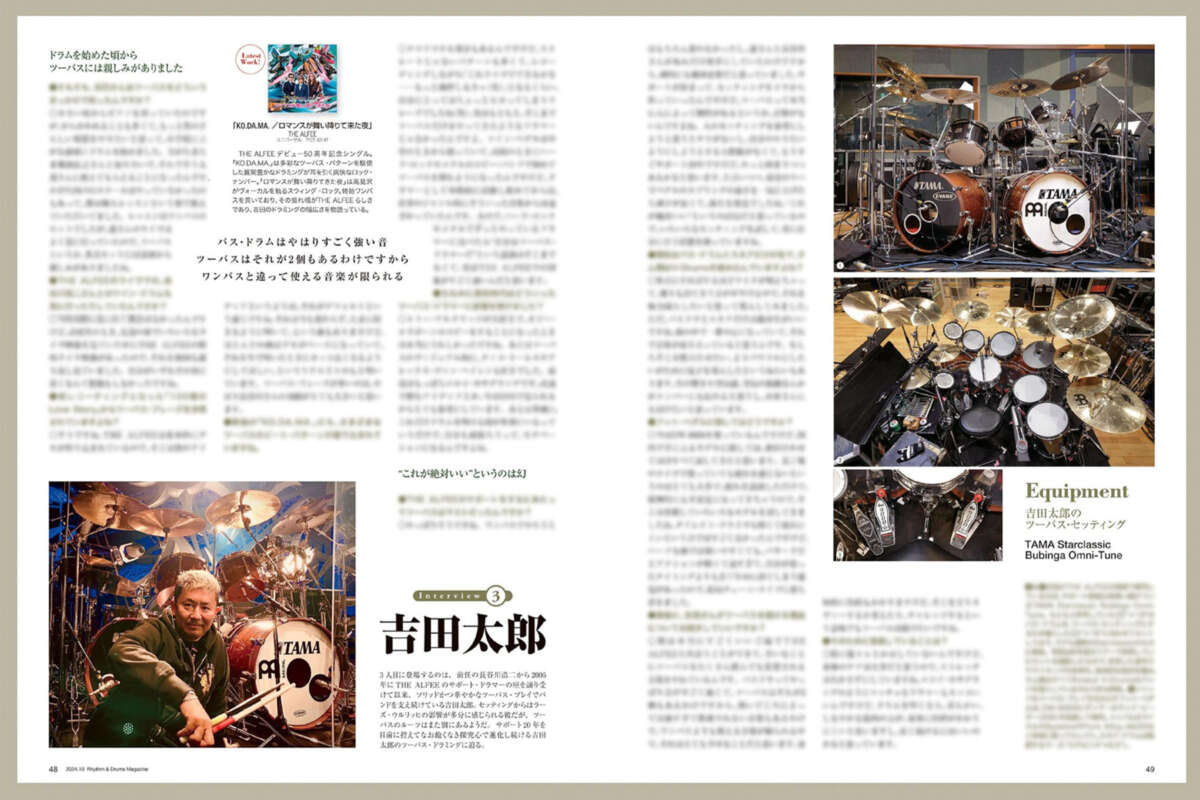 【Note】2006年よりTHE ALFEEのドラムを担い、現在に至るまでそのステージを支え続けている吉田太郎。小学生時代にはそうる透のレッスンを受けており、その系譜を感じさせるソリッドかつ華やかなプレイが特徴だ。約20年に渡るサポートを経てなお、「やっと固まりつつある」と語るその言葉からは、バンドと共に進化を続けてきた軌跡が垣間見える。2024年10月号のツーバス特集では、実際に使用しているドラム・セットや、初レコーディング曲「100億のLove Story」のエピソードについても語っている。ツーバス特集では、実際のセッティングの詳細や、THE ALFEEの楽曲におけるプレイの意図についても、さらに踏み込んだ言葉で語られている。その全容は、ぜひアーカイブで確かめてほしい。