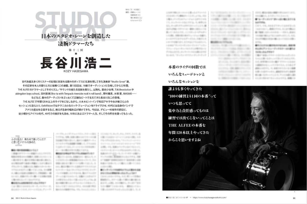 【Note】1983年、オーディションを経て高校生でTHE ALFEEのドラマーに抜擢された長谷川浩二。以降2005年の卒業まで、20年以上にわたりバンドのステージを彩ってきた。プロとしての経験のほぼすべてをTHE ALFEEで培ったと語り、現在は日本を代表するトップ・ドラマーとして活躍している。2023年10月号の「STUDIO GREAT」では、10000字を超えるロング・インタビューの中で、多忙を極めた当時の現場やプレイの背景を詳細に回顧。また1995年11月号ではギターの高見沢俊彦との特別対談も実現。オーディション時の詳細や、本番でのエピソードなど、インタビュー/対談の本編でさらに詳しく語られている。