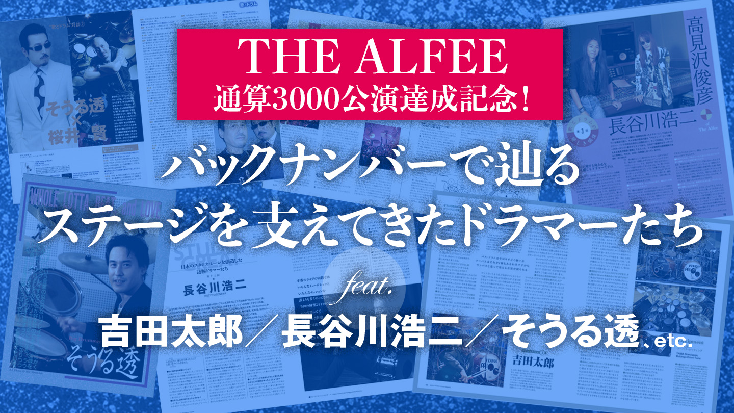 2024年にデビュー50周年を迎えたTHE ALFEEが、本日4月17日に東京ガーデンシアターで行われるライヴで、通算3000公演を達成。本記事では彼らのステージを支えてきたドラマーたちにフォーカス。現在のライヴを担う吉田太郎を筆頭に、長谷川浩二、そうる透など、THE ALFEEの歴史に名を刻むドラマーの足跡を、ドラム・マガジンのバックナンバーと共に振り返る。積み重ねられてきた“音の土台”に、あらためて目を向けてみたい。