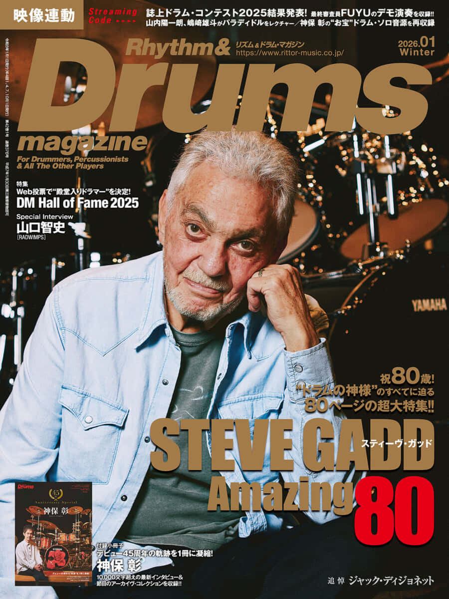御年80の“ドラムの神様”=スティーヴ・ガッドを大特集したドラム・マガジン26年1月号。その特集内で、「名演/名曲8曲をセレクトし、プレイリストを作成する」をテーマに、10名(合計80曲)の“プレイリスト”を聞いた「the Greatest Gadd Playlist」のリアル・イベントが1月18日、御茶ノ水RITTOR BASEにて行われた。