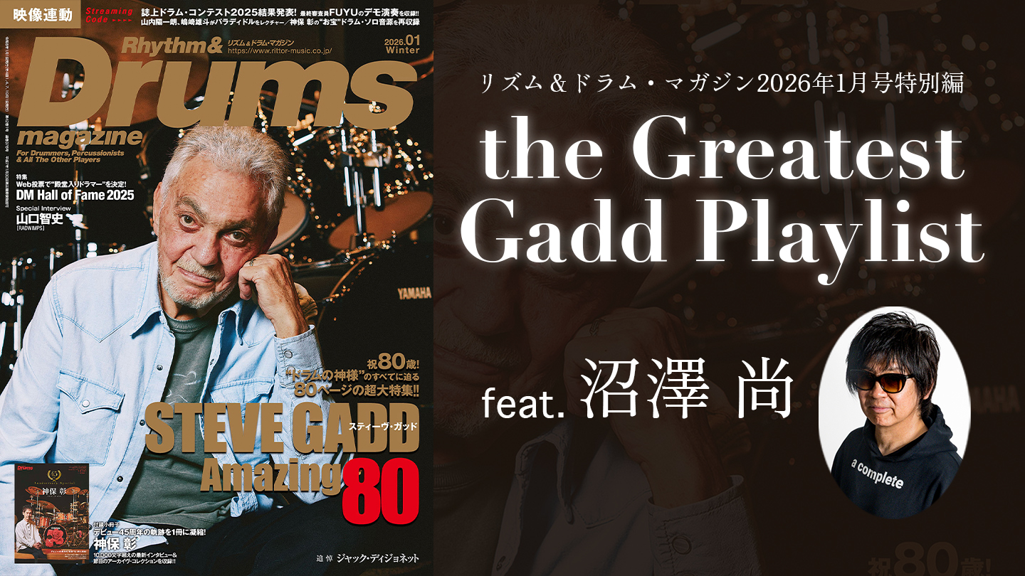 御年80の“ドラムの神様”=スティーヴ・ガッドを大特集したドラム・マガジン26年1月号。その特集内で、「名演/名曲8曲をセレクトし、プレイリストを作成する」をテーマに、10名(合計80曲)の“プレイリスト”を聞いた「the Greatest Gadd Playlist」のリアル・イベントが1月18日、御茶ノ水RITTOR BASEにて行われた。